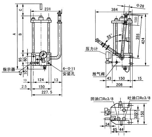 5、泵上回油指示器的作用是操作者通过观察指示器活塞指示杆的运动行程,就可知道润滑系统的供油状况。使用时,先计算好各润滑部位所需的给油量,配置分配器,并把主分配器上多设的一个出油口与手动润滑泵的回油口接通,使润滑脂返回到指示器中,如返回的油量累计达到3.28mL,则指示器的活塞指示杆全部伸出,表示各润滑点已根据需要完成一个周期的给油,应停止供油并把回油指示器的指示杆推进。 |