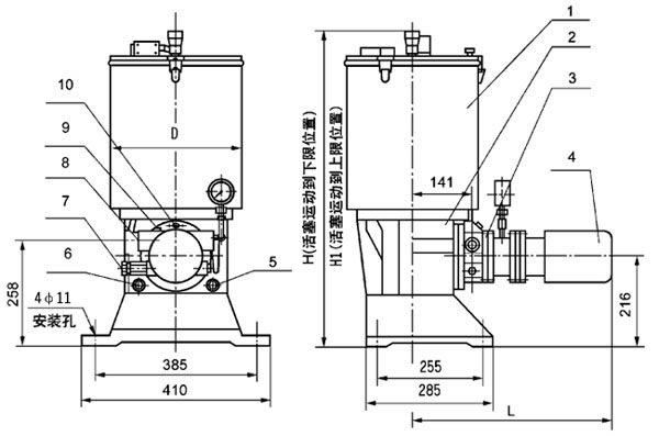 3、首次使用前应先加入一定量的润滑油,让泵运转几分钟后再从补脂口以封闭方式用电动加油泵加入润滑脂。