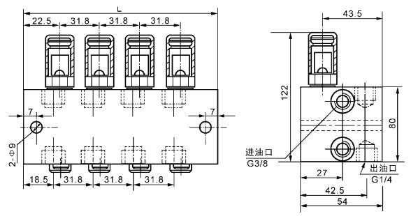 若需相应上下出口合并时,只要将孔内的螺钉拧出,把上或下不用的那个出油口用G1/4螺塞封堵以防灰尘侵入。