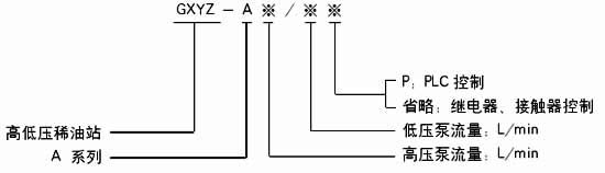 | 如采用A系列,高压流量为2.5L/min;高压压力为31.5MPa,低压供油压力为0.4MPa;而低压供油量为40L/min的高(低)压稀油站,采用PLC控制的则按如下方法标注:GXYZ-A2.5/40.P |