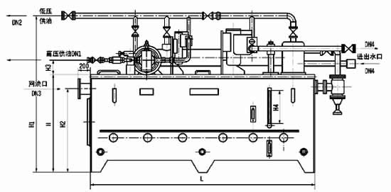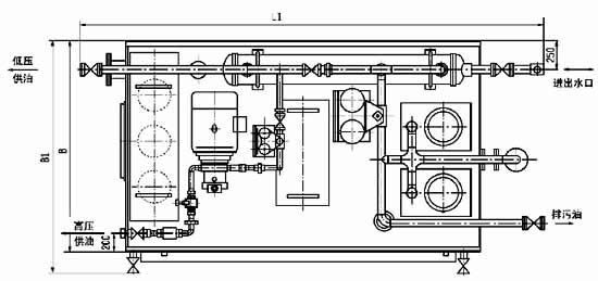 本油站为整体式,由油箱、两台低压油泵、一台高压油泵、二台双筒网片式过滤器、回油磁网过滤装置、列管式油冷却器、各种控制阀门、管道以及电接点压力表、铂热电阻等组成。