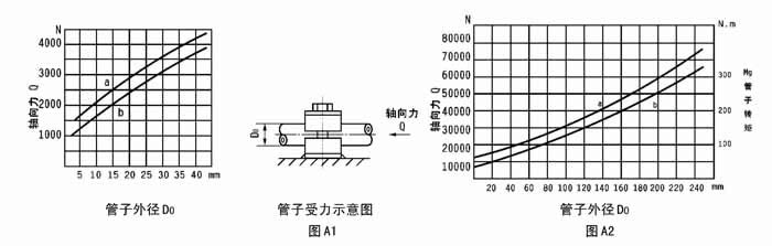 A2 具体内容:图A1 用于“A 系列管夹”;图A2 用于“B 系列Ⅰ型管夹”。a 曲线表示管夹与管子处于“静摩擦状态”时,管子外径尺寸与管夹承受管子轴向力的函数关系。b曲线表示管夹与管子处于“动摩擦状态”时,管子外径尺寸与管夹承受管子轴向力及转矩的函数关系。 |